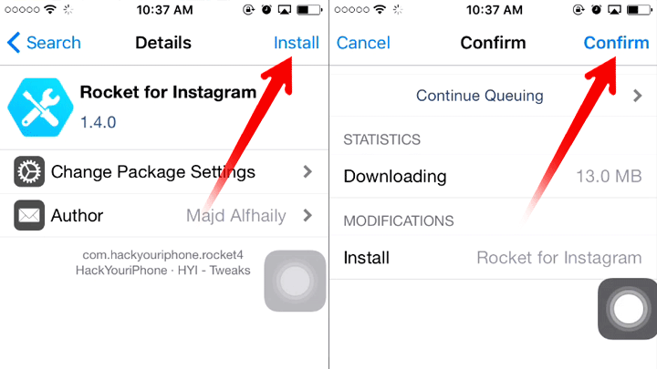 2. Pilih tweak “Rocket For Instagram” – Pilih Author, lalu Tap menu install di kanan atas – lalu Tap Confirm.