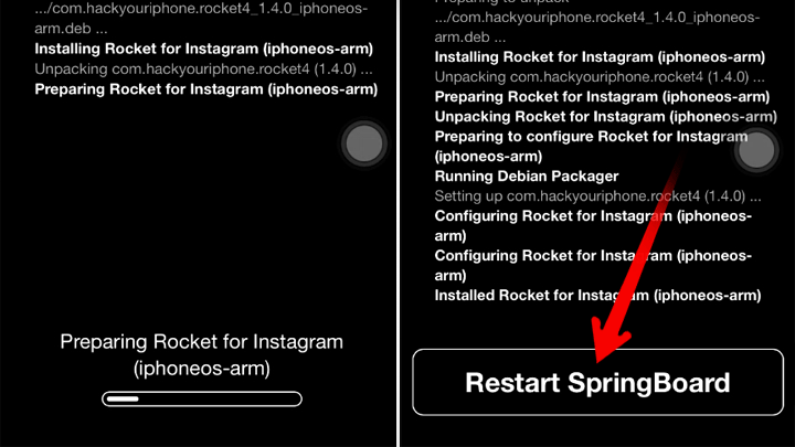 3. Cydia akan meng-install tweak tersebut, lalu kamu diminta untuk menunggu beberapa saat hingga proses penginstallan selesai –Tap “restart springboard”