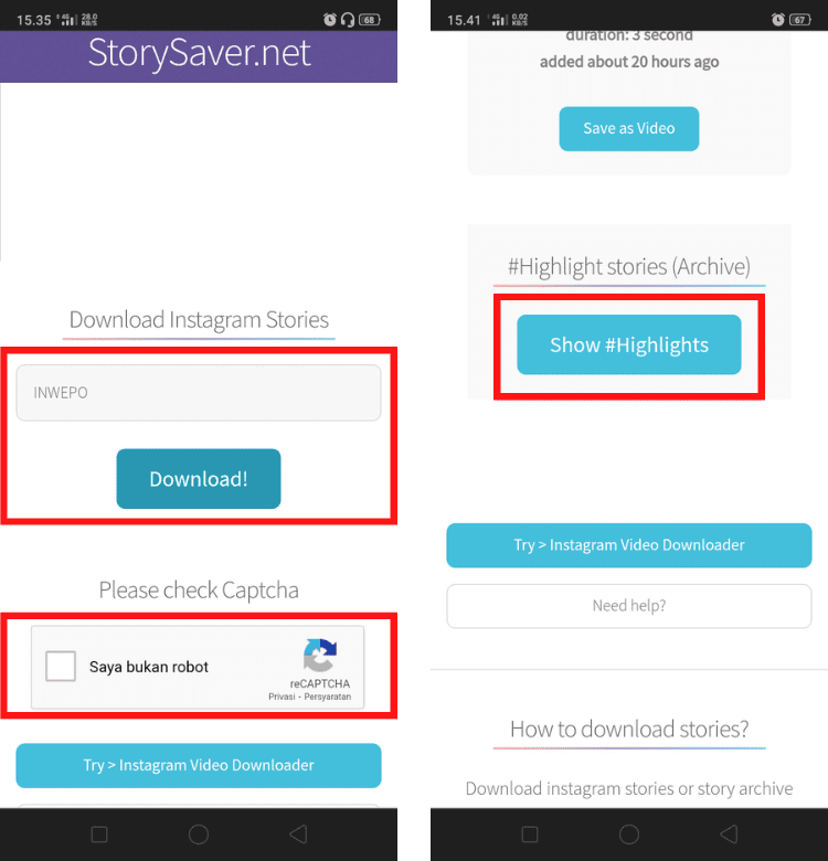 3. Setelah situs Storysaver terbuka, ketikkan nama username Instagram pada kolom yang tersedia dan tekan tombol Download. beri checklist pada kolom captcha. Tunggu beberapa saat sampai situs berhasil mengakses akun Instagram tersebut.