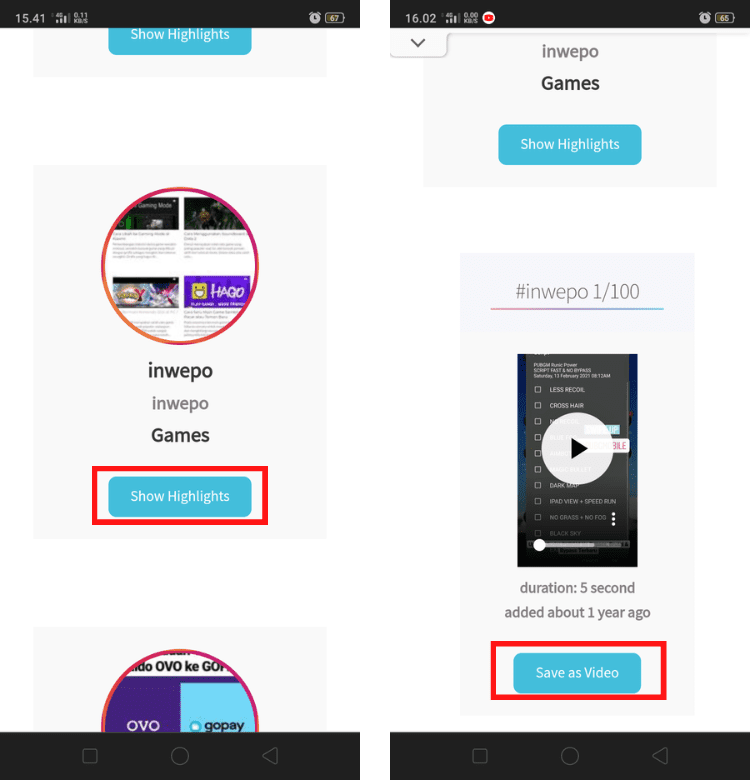 5. Tunggu beberapa saat sampai situs berhasil menampilkan postingan highlight akun Instagram tersebut. Kemudian, situs akan menampilkan semua judul highlight yang tersimpan pada akun Instagram tersebut. Klik tombol Show Highlights pada salah satu judul untuk melihat semua daftar highlight yang tersimpan. Untuk mendownload serta menyimpan salah satu highlight, cukup dengan klik Save as Video atau Save as Photo.
