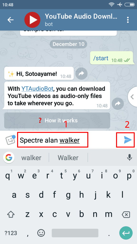 2. Langsung saja ketikkan lagu yang ingin kamu unduh dengan membalas chat ke ytaudiobot kemudian kirim.