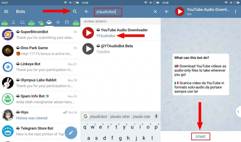 1. Masuk ke aplikasi Telegaram, pada kolom pencarian ketikan ” ytaudiobot ” kemudian tap start.