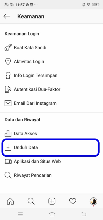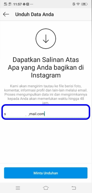 6. Pada halaman Unduh Data masukan alamat email untuk menerima semua foto dan video yang akan dikirimkan oleh pihak Instagram, lalu tekan tombol Minta Unduhan.