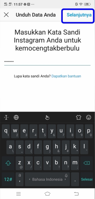 7. Lalu masukan Kata Sandi akun Instagram kamu, kemudian tekan tombol Selanjutnya.