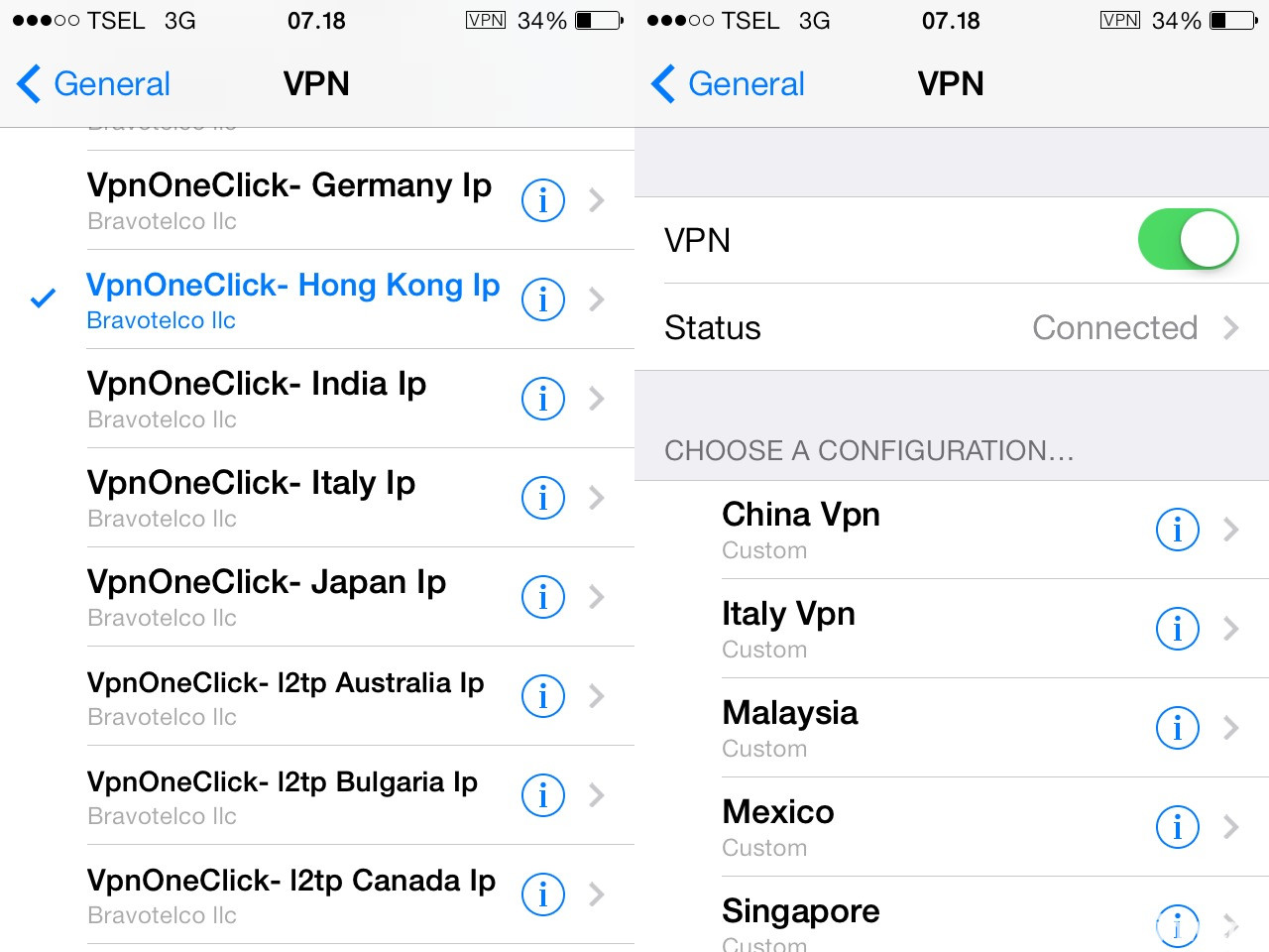 3. Aktifkan VPN caranya masuk ke pengaturan (Settings) – pilih VPN yang ingin digunakan. contoh: Hongkong.