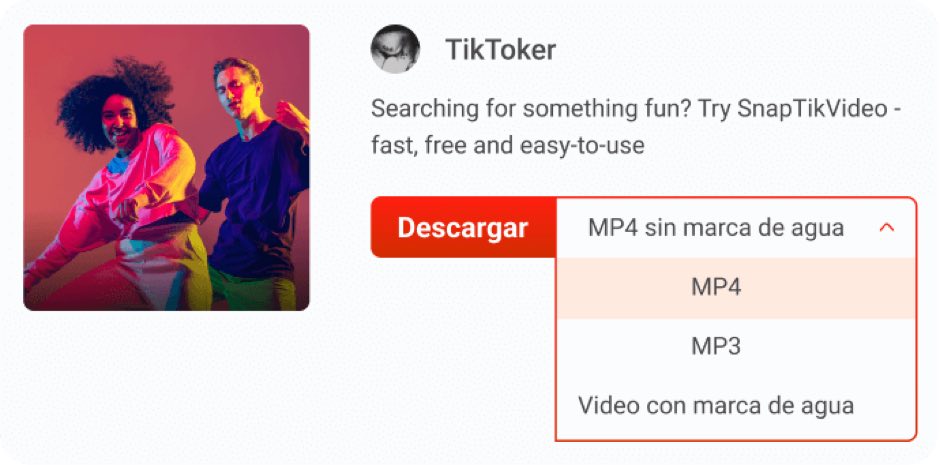 Tekan tombol di sebelah bilah dan tunggu gambar thumbnail dan opsi posting muncul. Sekarang, pilih antara MP3 dan MP4 dengan atau tanpa tanda air; Setelah siap, klik untuk memulai download.