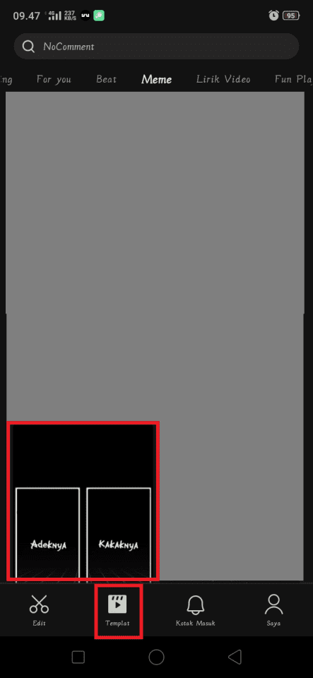 1. Buka aplikasi CapCut di perangkat smarphone kita dan kemudian pilih menu Templat. Cari dan pilih salah satu video template yang ingin di download.