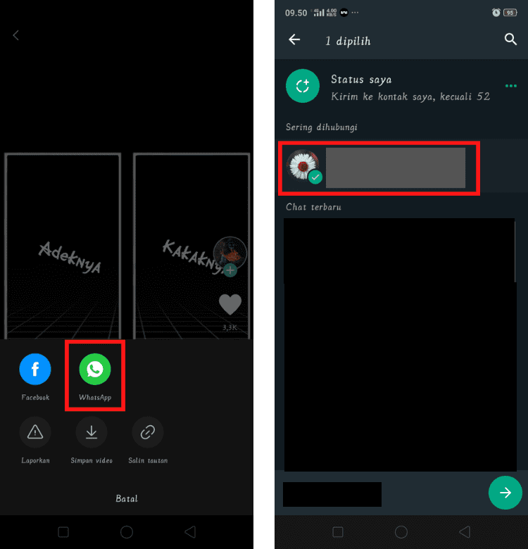 2. Tekan video template yang dipilih untuk melihat tampilan dari video tersebut. Apabila kita ingin mendownload video template tersebut tanpa watermark CapCut, tekan ikon titik tiga di menu video CapCut dan kemudian pilih bagikan ke aplikasi WhatsApp. Kemudian pilih salah satu kontak di aplikasi WhatsApp. Disini, penulis mengirimkan link video CapCut ke kontak pribadi selain itu, kita bisa mengirimkan link video ke kontak saudara maupun teman terdekat.