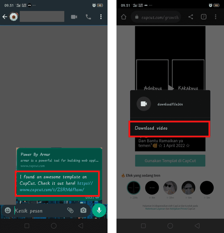 3. Setelah link video berhasil dikirimkan, tekan link video dan kemudian kita akan diarahkan ke aplikasi browser. Pada aplikasi browser tersebut akan menampilkan video template CapCut yang sudah kita kirimkan sebelumnya menggunakan aplikasi WhatsApp. Untuk bisa mendownload video tersebut, tap lama pada video dan kemudian tekan menu Download video.