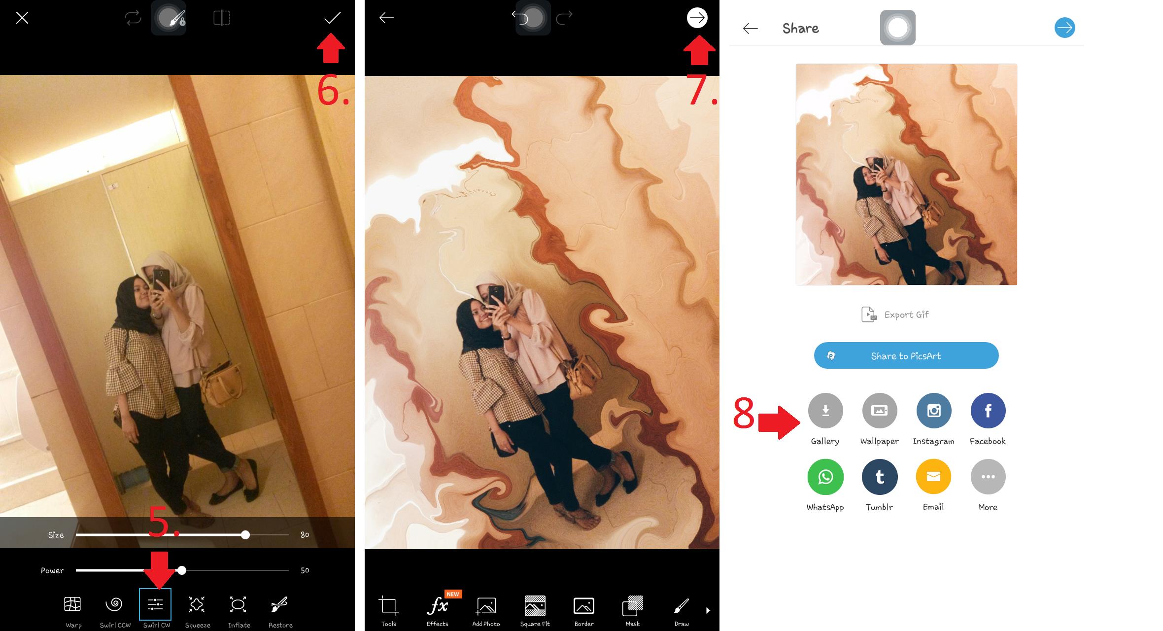 8. Tap (->) untuk menyimpan/bagikan hasil editan kamu.
