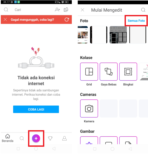 3. Buka aplikasi. Klik ikon ‘+’ untuk memulai edit foto. Klik ‘Semua Foto’ dan cari foto frame yang sudah di download sebelumnya.