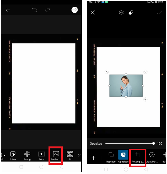 4. Setelah foto frame tersedia, klik ‘Tambah Gambar’ untuk menambahkan foto selfie kamu. Potong ukuran foto sesuai dengan bentuk frame, klik ‘Potong Gambar’.