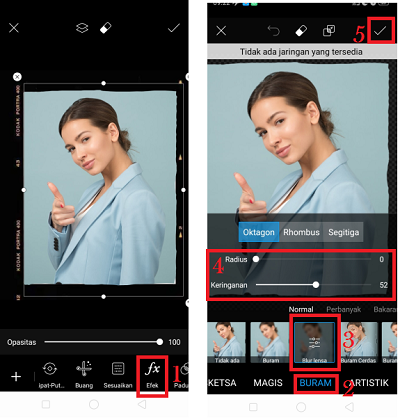 6. Terakhir, tambahkan efek di dalam foto selfie. Pilih ‘Efek’. Pilih kategori efek ‘Buram’ – pilih efek ‘Blur Lensa’ – buka pengaturan efek – kurangi nilai radius menjadi 0, dan tambahkan nilai keringanan menjadi 52. Klik centang.