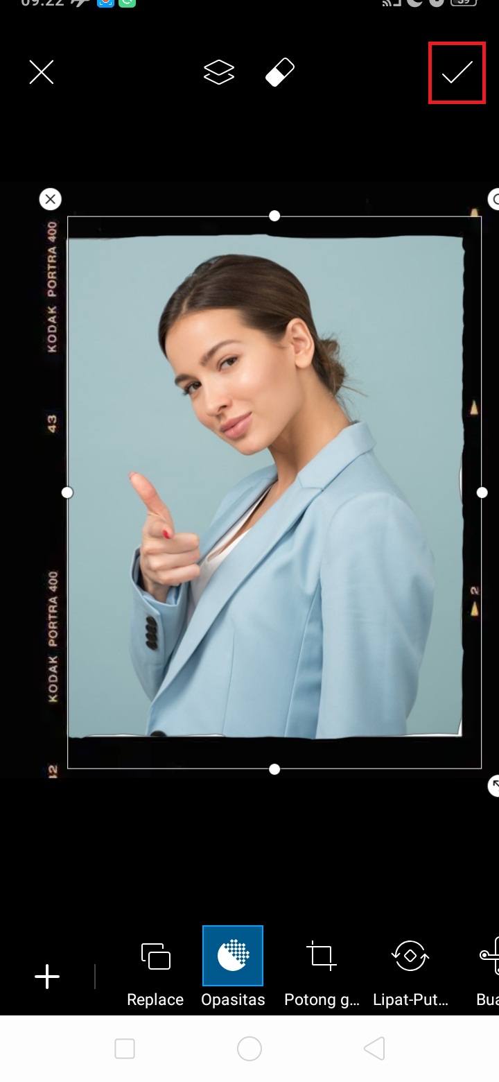 5. Perbesar ukuran foto selfie kamu, sampai memenuhi foto frame. Karena ada foto selfie yang menutupi foto frame, hapus bagian foto selfie tersebut. Untuk mempermudah menghapus, klik ‘Opasitas’ – kurangi nilai opasitas menjadi sekitar 50% – klik ikon ‘Hapus’ di menu atas. Hapus bagian foto selfie yang menutupi foto frame, dan klik centang.