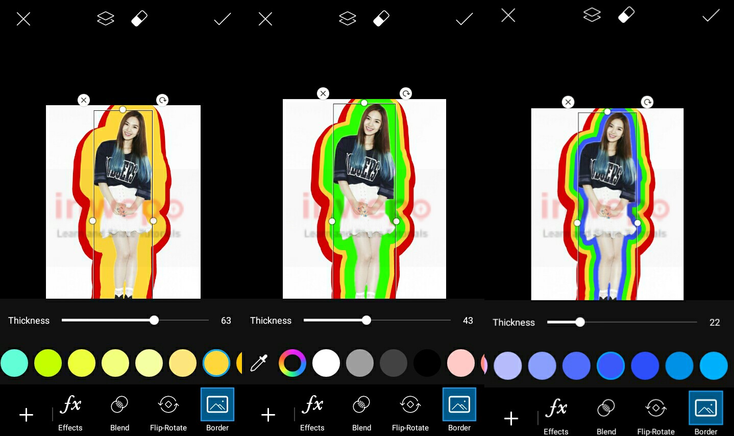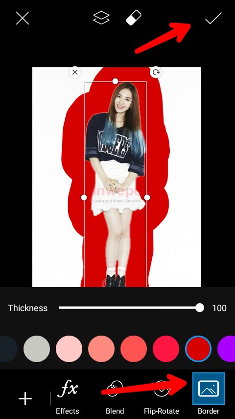 4. Lanjut, setelah itu kamu buat outline dengan warna pertama. Geser menu di bagian bawah dan temukan menu Border – Pilih warna sesuai selera – Setelah selesai pilih tanda Centang ‘✔’.