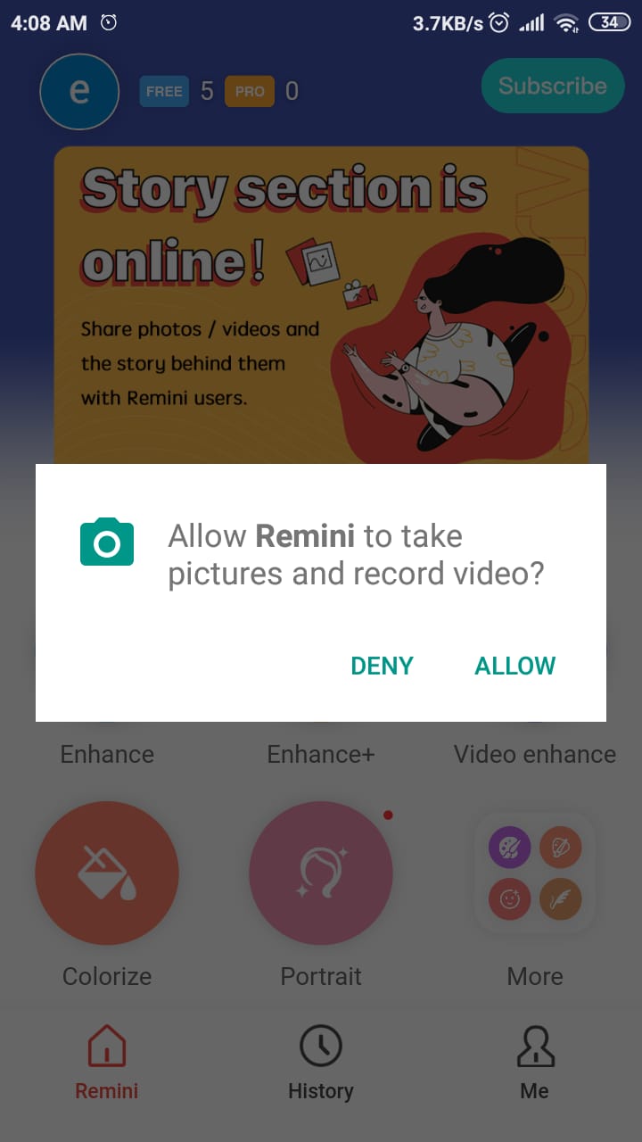 4. Kemudian kamu akan masuk pada menu utama ( dashboard ) kamu pilih izinkan / allow jika kamu tidak izinkan maka kamu tidak akan bisa mengeksport gambar yang ingin kamu edit ke Remini
