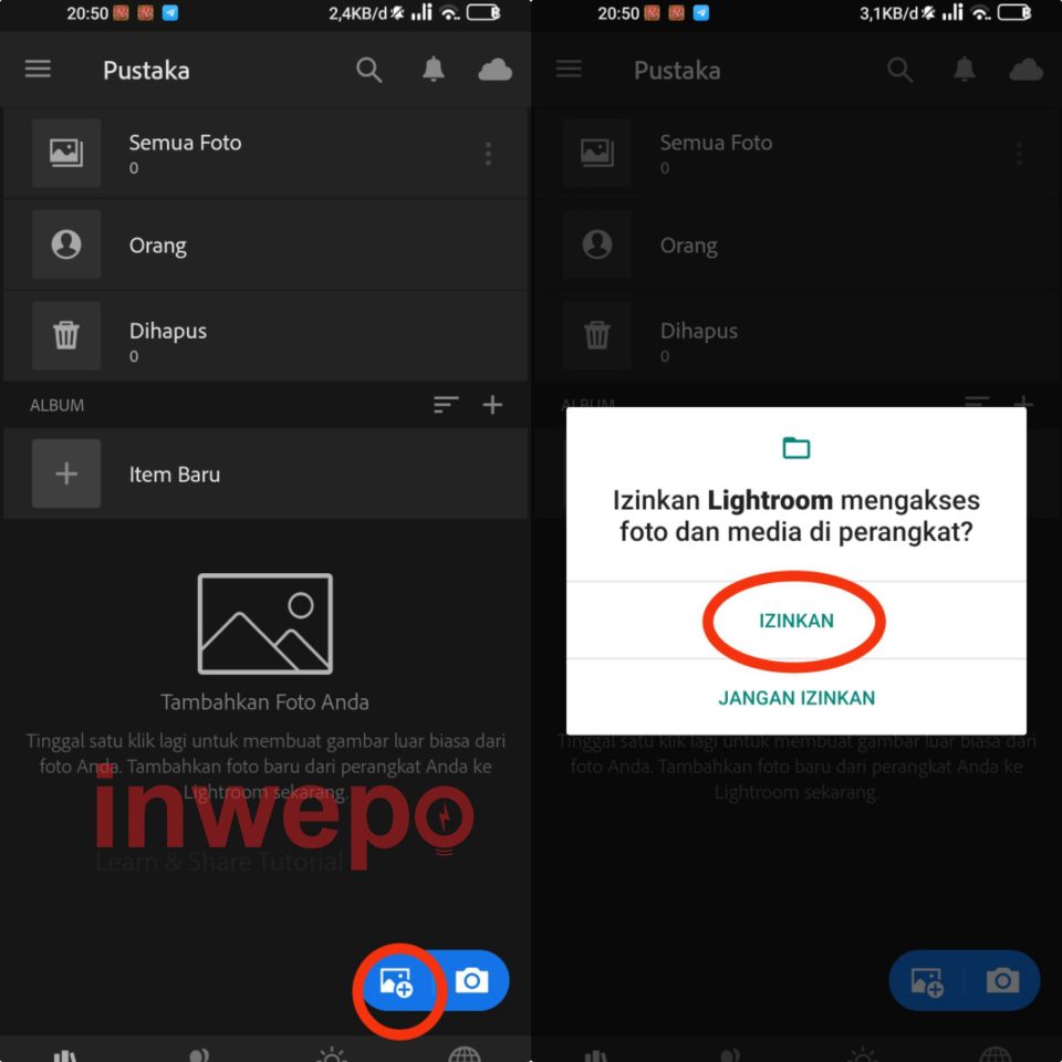 2. Setelah terinstall silahkan login atau daftar terlebih dahulu ke akun kalian masing-masing. Tap icon picture plus di bagian bawah untuk mulai menambahkan foto. Lalu tap Izinkan untuk pop up Notification yang muncul.