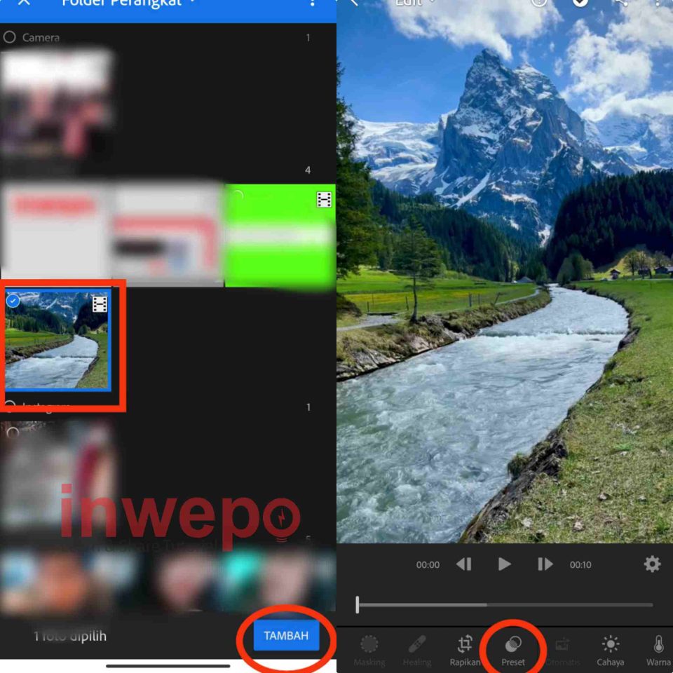 3. Pilih video yang akan kalian edit kemudian tap menu Tambah di bagian pojok bawah. Kalian bisa menambahkan preset dengan tap menu Preset.