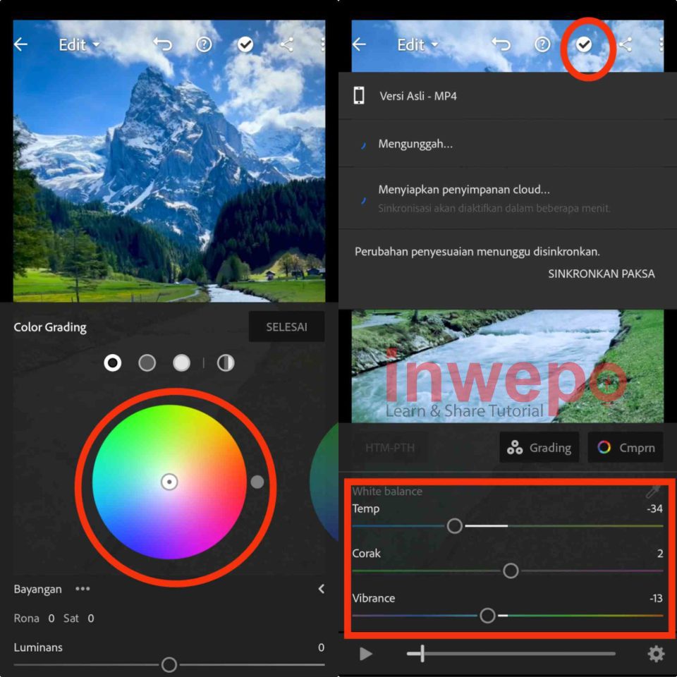 5. Untuk menambahkan color Grading kalian cukup memilih pada round palette colour. Selanjutnya jangan lupa juga atur white balance, corak, dan lain – lain. Lalu tap ceklist di bagian atas untuk mulai menyimpan hasilnya.