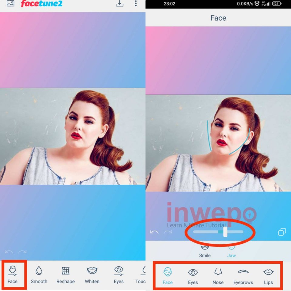2. Tap menu Face untuk mengedit bagian pipi, mata, hidung, alis dan bibir. Gunakan slider untuk mengaturnya.