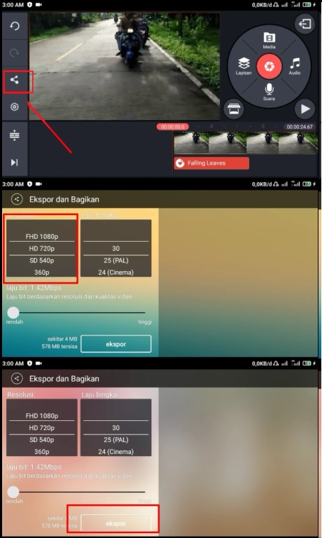 5. Tahap terakhir yaitu menyimpannya. Klik Icon Share di sebelah kiri layar. Pilih resolusi yang kalian butuhkan, lalu pencet tombol ekspor.