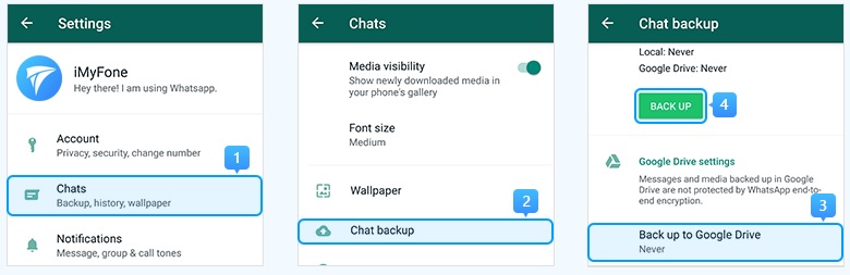 Selanjutnya proses backup akan berjalan, apabila kamu belum pernah melakukan backup di HP, maka nanti kamu akan diarahkan untuk melakukan backup terlebih dahulu di HP kamu. Ikuti petunjuk pada aplikasi iTransor for WhatsApp.