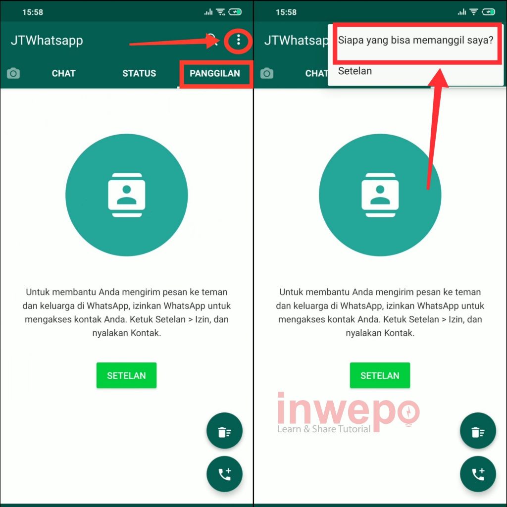 3. Langkah ketiga, untuk memfilter panggilan, tap menu PANGILLAN lalu tap 3 titik dan kemudian tap Siapa yang bisa memanggil saya?