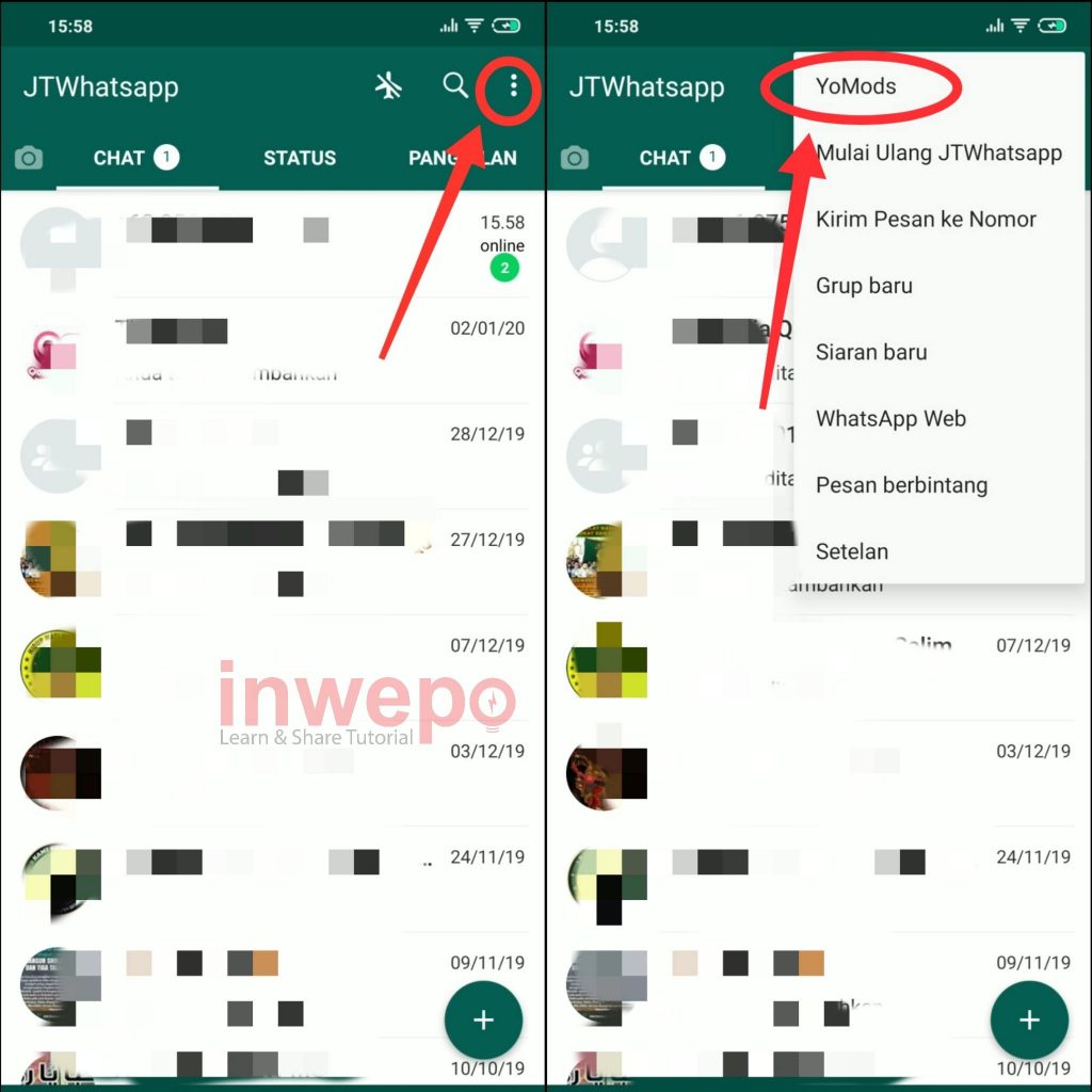 5. Langkah kelima, untuk mengaktifkan status anti hapus tap menu CHAT lalu tap 3 titik dan pilih YoMods.