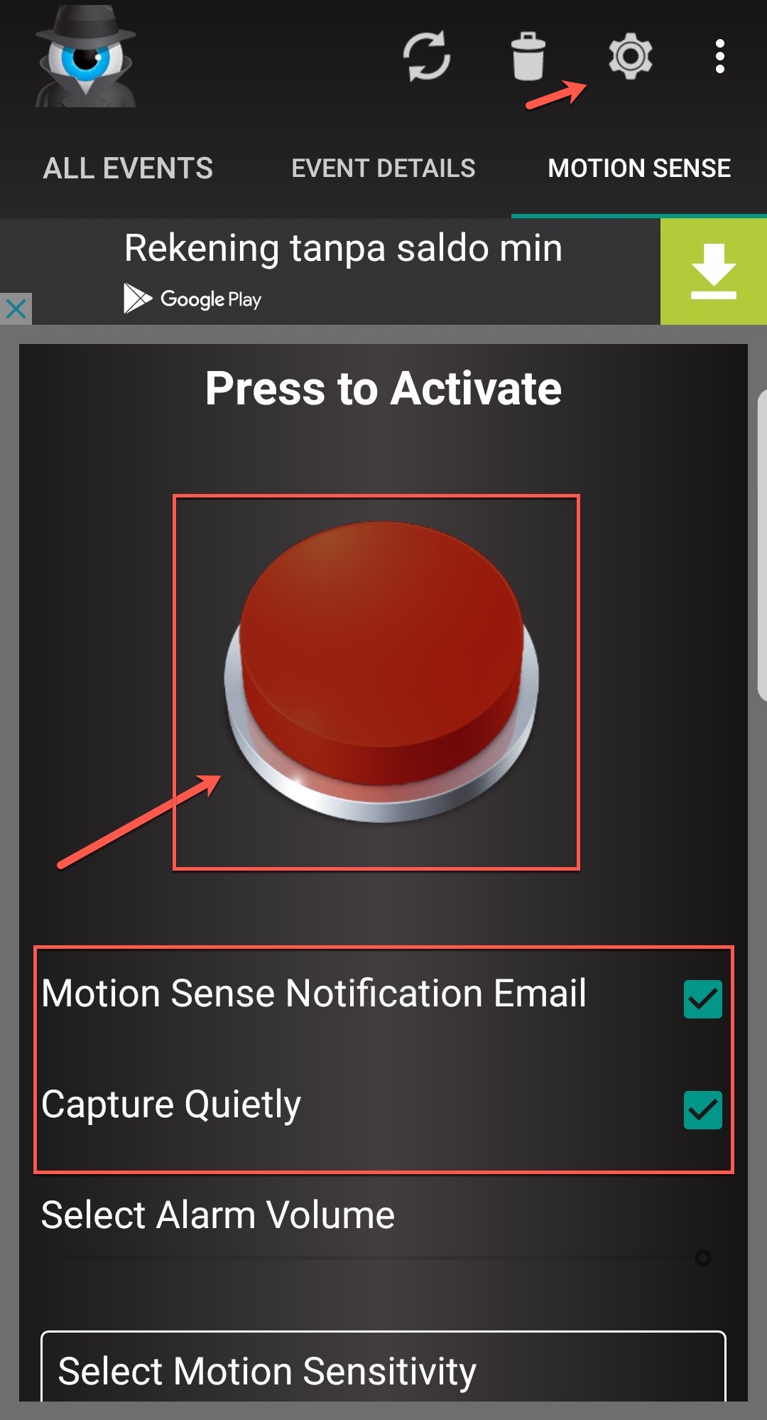 3. Selanjutnya masuk ke menu “MOTION SENSE“, centang “Motion Sense Notification Email“, dan “Capture Queity“. Lalu tap “Press to Activate” untuk mengaktifkan aplikasi Secret Control.