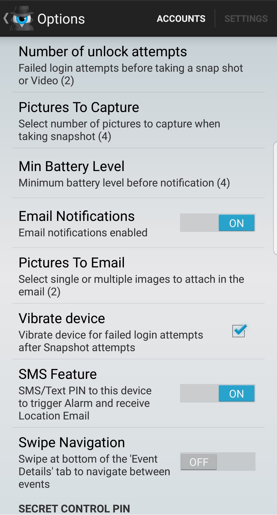 Secret Control – Anti-theft merupakan aplikasi keamanan yang dapat memfoto wajah si pelaku jika gagal membuka kunci pola (pattern lock) awal masuk pada smartphone serta juga mengirimkan lokasi smartphone terakhir berada melalui email yang telah kamu daftarkan.