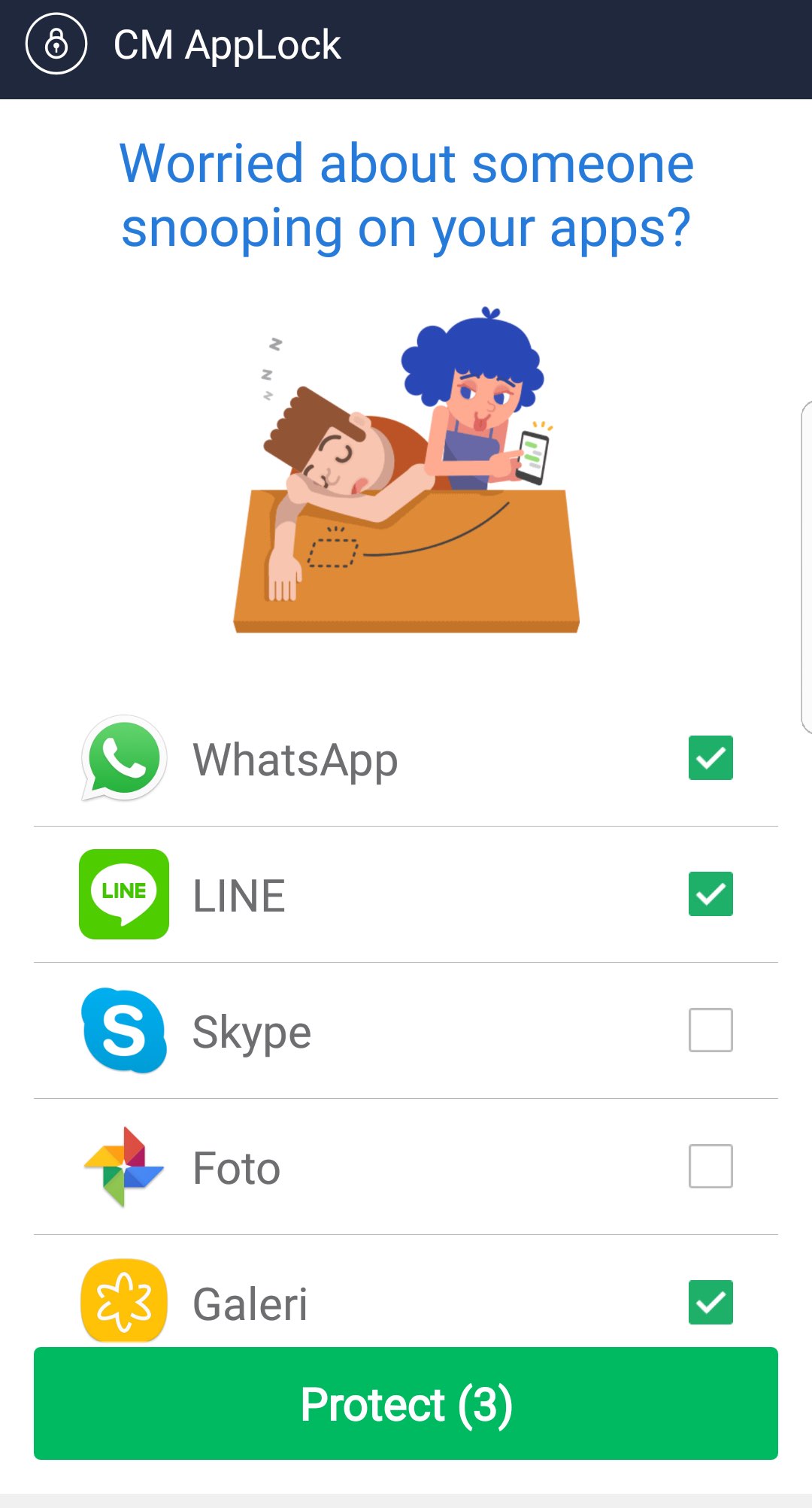 2. Jalankan aplikasi AppLock. Pilih aplikasi apa saja yang ingin diberikan kunci pola (password). Jika sudah pilih “Protect“.