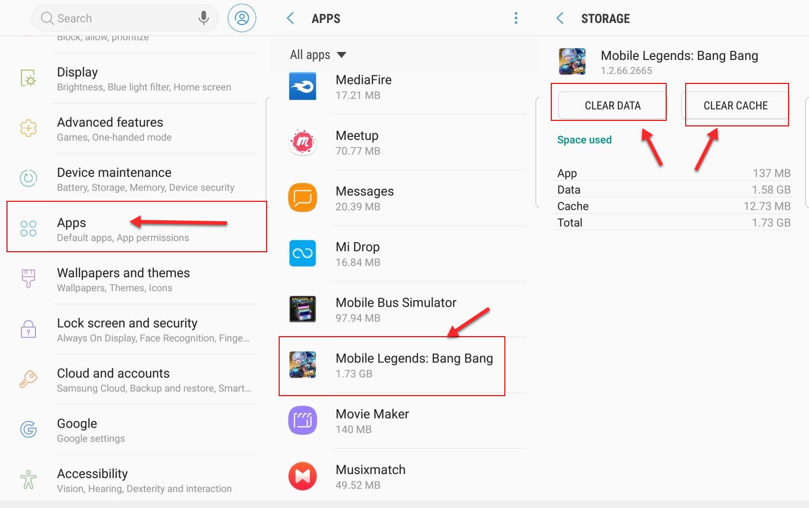 2. Buka aplikasi Pengaturan (Settings) – Instalan aplikasi/Apps – Pilih Mobile Legends.