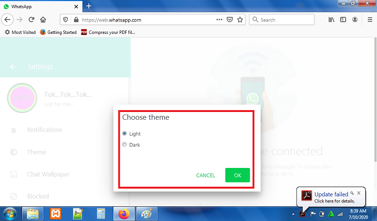 Pilih dark theme untuk mengubah WhatsApp Web kamu menjadi dark mode dan klik oke.