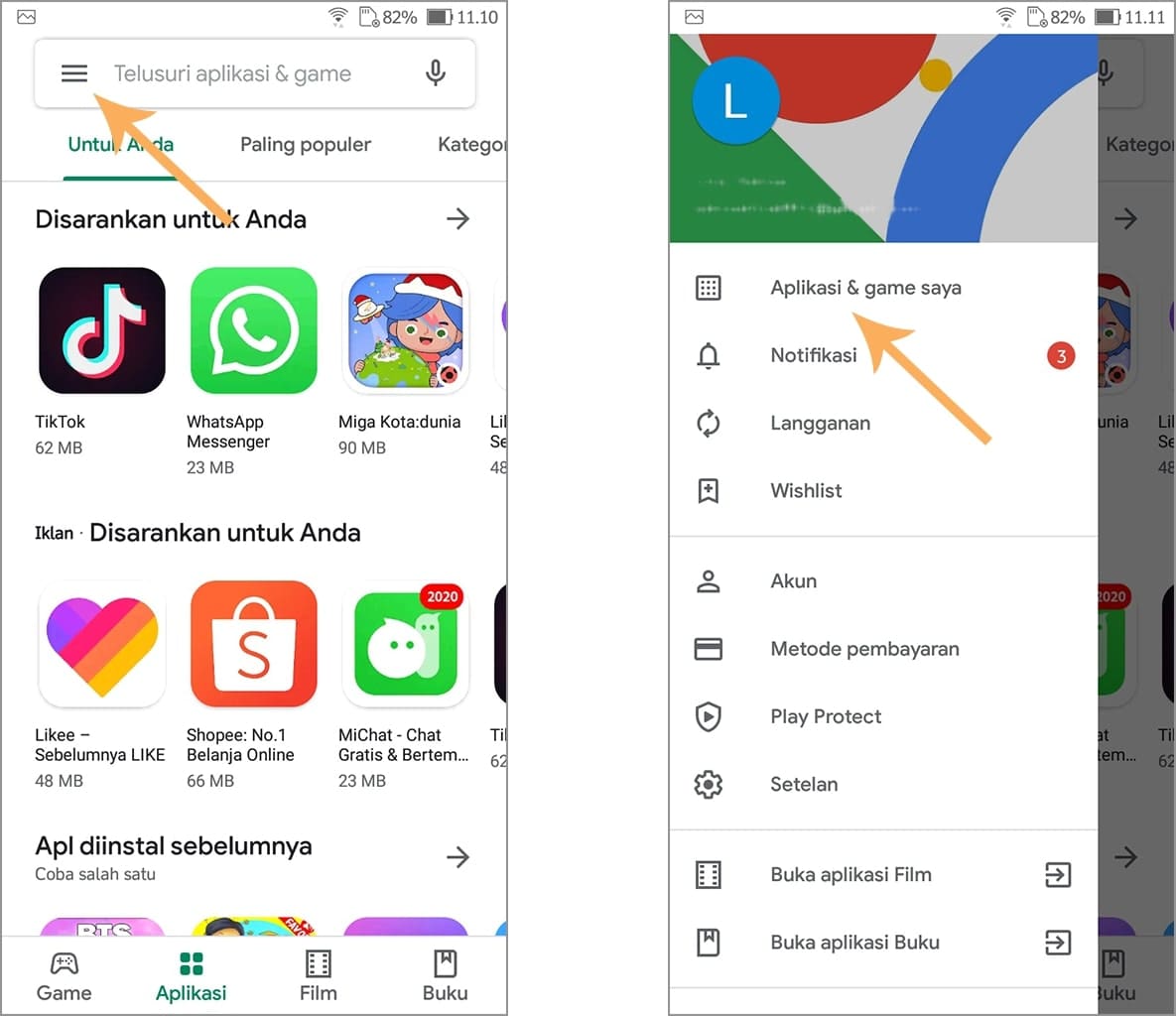 2. Jika sudah, silakan ketuk tiga garis vertikal, kemudian pilih aplikasi dan game saya.