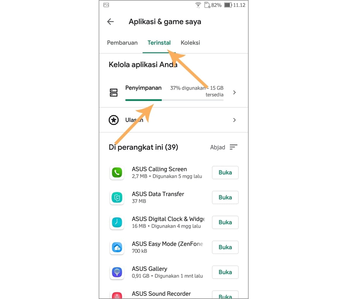 3. Ketuk tab terinstal, kemudian ketuk penyimpanan.