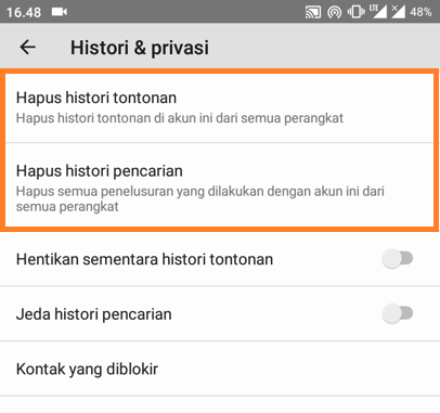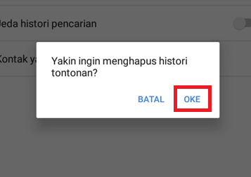7. Lalu kamu tap kedua pilihan yang terdapat pada gambar yaitu pilihan pertama Hapus Histori Tontonan untuk menghapus histori video yang telah kamu tonton, dan pilihan kedua hapus histori pencarian untuk menghapus histori jejak pencarian pada kolom pencarian di aplikasi Youtube.