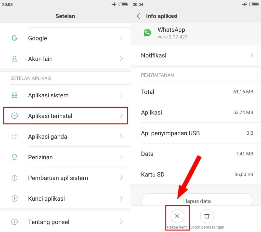 2. Pergi ke setelan kemudian aplikasi terinstall cari WhatsApp lalu Paksa berhenti pada aplikasi WhatsApp.