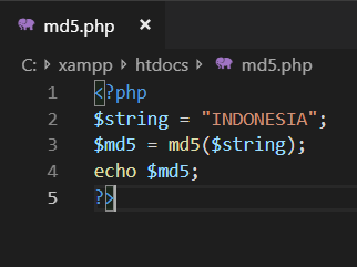 Pada baris kedua merupakan deklarasi variabel $string yang dimana data dari variabel tersebut adalah INDONESIA, lalu pada baris ke 3 merupakan fungsi utama dari script ini dimana terdapat fungsi md5() disertai variabel $string didalamnya sehingga fungsi tersebut melakukan encode atau hash ke data dari variabel $string, lalu hasil dari encode atau hash tersebut disimpan pada variabel $md5. Untuk menampilkan data dari variabel $md5 kita memerlukan fungsi yang nama echo seperti pada baris ke 4.