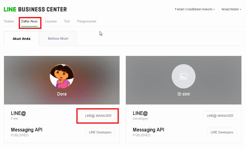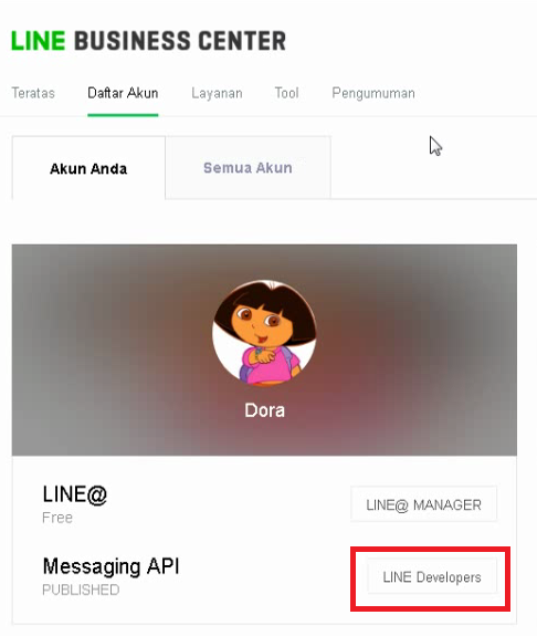 5. Kembali ke tab “Daftar Akun” Di LINE Business Center. Pilih LINE Developers.