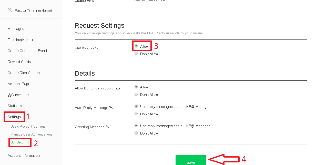 4. Lalu masuk ke tab settings – Bot Settings – Allow Webhook – Save.