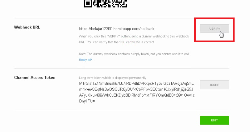 Webhook URL adalah layanan yang sudah tersedia di LINE messaging API yang dirancang oleh LINE sebagai layanan CallBack atau bisa dibilang telepon balik seperti kita mengucapkan kata-kata maka si layanan callback ( webhook URL ) ini akan merespon-nya sesuai coding yang sudah dipasang pada Heroku, misalnya seperti Simsimi, kita mengirim kata “Simi lagi ngapain?” maka Simi akan menjawab “Lagi Makan” nah itu merupakan fitur Webhook URL / CallBack