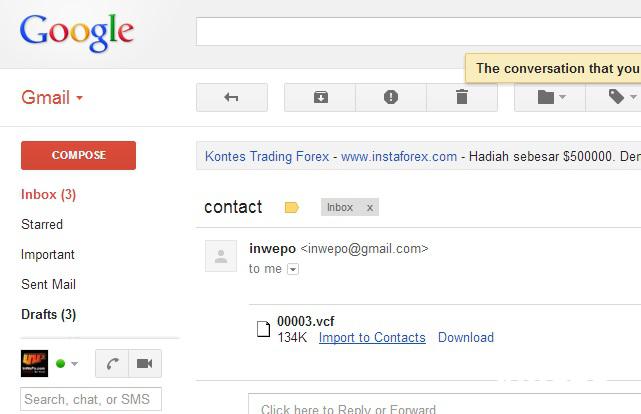 3. Buka pesan di gmail.com akses menggunakan komputer PC/Laptop di browser. Kemudian klik “import to contacts”.