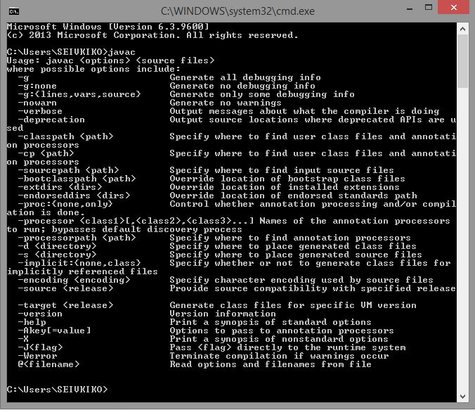 4. Untuk mencoba apakah JDK yang telah diinstal dan di setting pathnya sudah dapat berfungsi, kalian dapat membuka CMD, pada keyboard tekan windows+R > ketikan “cmd” tanpa tanda kutip. Jika sudah ketikan “javac” pada CMD tanpa tanda kutip. Jika muncul seperti dibawah ini maka proses instalasi JDK berhasil :