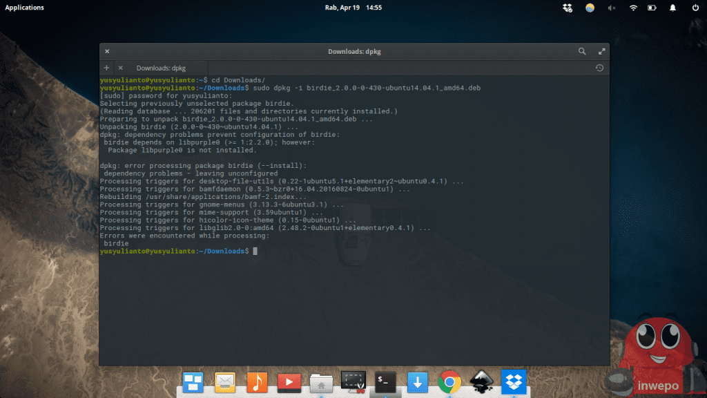3. Jalankan perintah untuk melakukan instalasi yaitu perintah “sudo dpkg -i namaplikasi.deb”.
