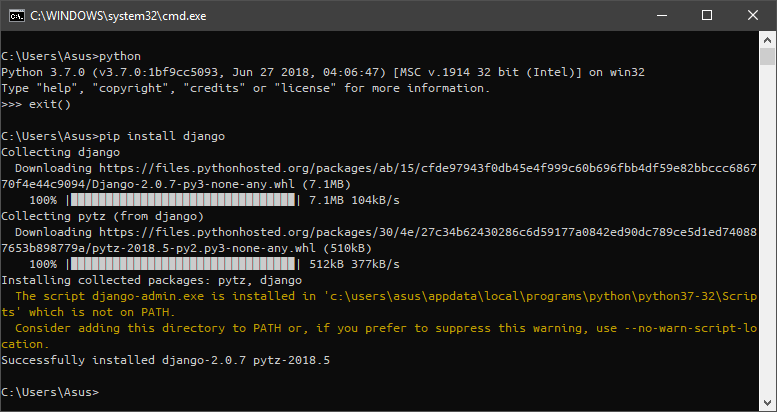 2. Tunggulah beberapa saat hingga proses instalasi berhasil di lakukan. Jika sudah, nantinya akan muncul informasi bahwa proses instalasi telah selesai, serta pemberitahuan bahwa Django telah di install.