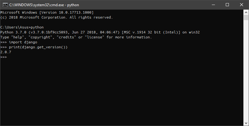 3. Untuk memastikan apakah Django benar-benar terinstall kedalam sistem operasi kita, maka langkah selanjutnya ialah membuka aplikasi python di dalam Command Line atau Terminal. Lalu, masukkan perintah berikut: