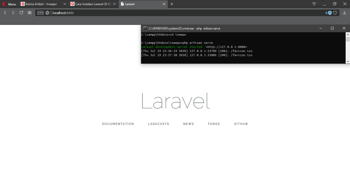Jika muncul tulisan Laravel development server started pada Command Prompt atau Terminal, maka langkah selanjutnya ialah pergi menuju link yang telah di sediakan oleh Laravel. Secara default, kita akan di arahkan menuju alamat server (yaitu 127.0.0.1:8000). Nantinya, kita akan di suguhkan dengan tampilan homepage dengan tulisan Laravel di bagian tengah.