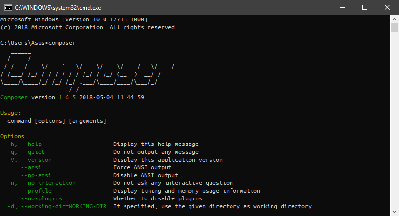 2. Untuk memastikan bahwa Composer telah terinstall, masukan perintah composer kedalam Command Prompt atau Terminal kamu. Jika sudah terinstal, nantinya composer akan menampilkan informasi dasar berupa versi serta cara penggunaan dari aplikasi Composer.