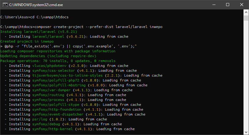 Jika perintah telah berhasil di masukkan, maka Composer akan mulai melakukan proses pengambilan data serta instalasi Laravel kedalam direktori yang telah kita tentukan. Pastikan bahwa koneksi internet dalam keadaan stabil agar tidak terjadi gangguan pada saat proses pengambilan data Laravel.