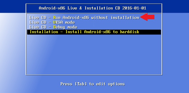8. Tekan ‘Live CD – Run Android without installing‘.